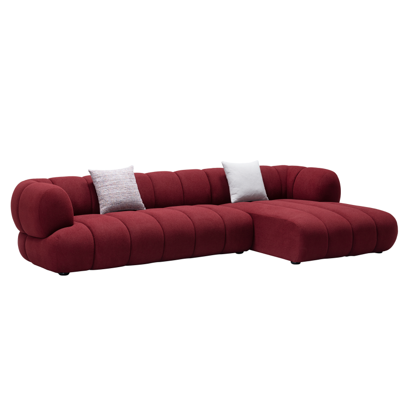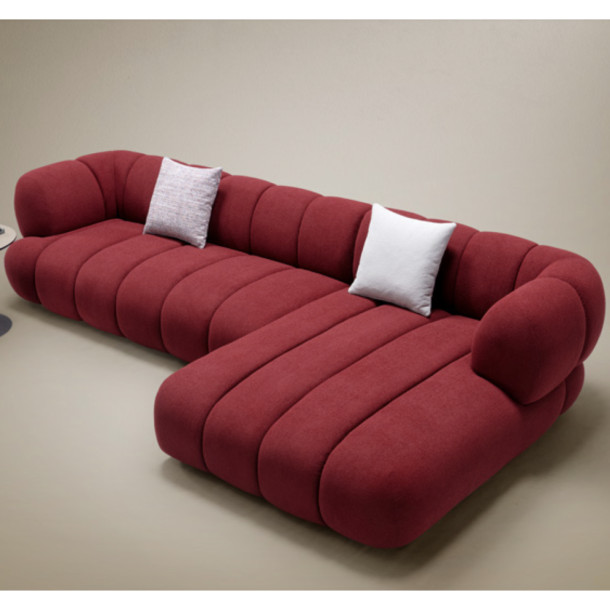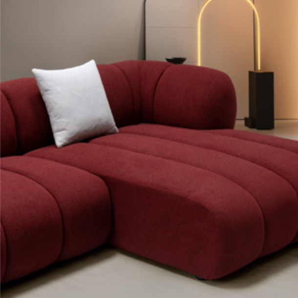 Three seater corner, as shown, characterised by the undulating lines, cosy forms and sumptuous bouclé fabric that evoke feelings of warmth and sensuality, while capturing memories of childhood daydreams of resting on a billowing cloud. The absence of rigid lines or sharp edges with its almost cocoon-like silhouette makes it a versatile design suitable for a range of interior styles. Available in other fabrics and as a three seater or two seater.